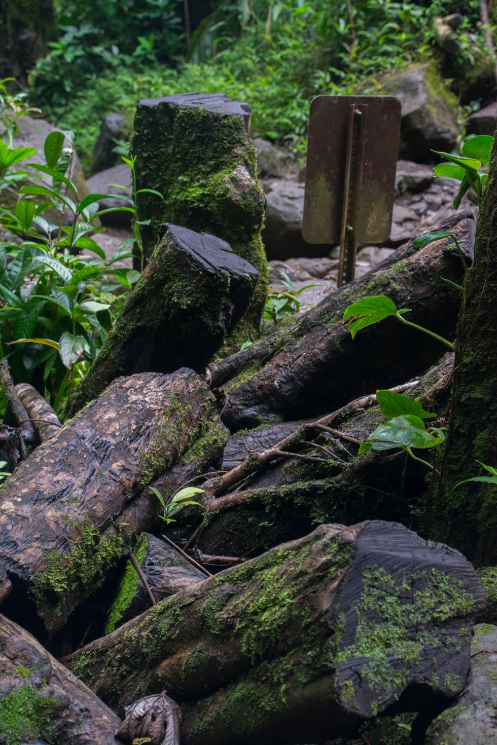 Because of the constant rain, and erosion, many trees fall over. While this can be good ecologically for forests, it can be bad for hiking. Many trees are cut and stacked beside trails and are left to decompose naturally, with fungi and mosses slowly breaking them down.