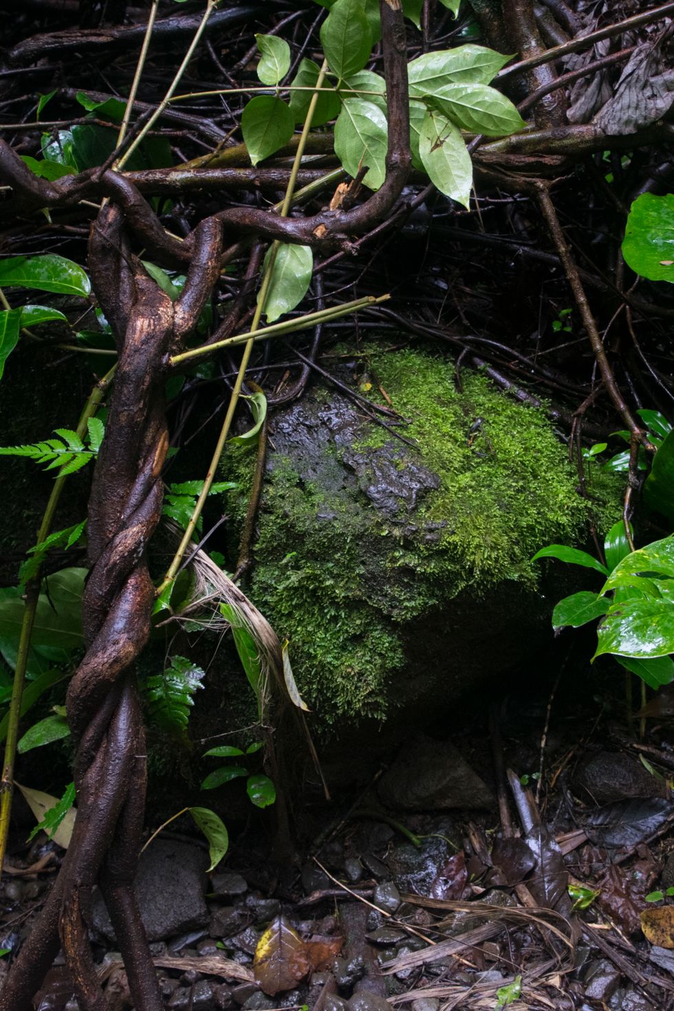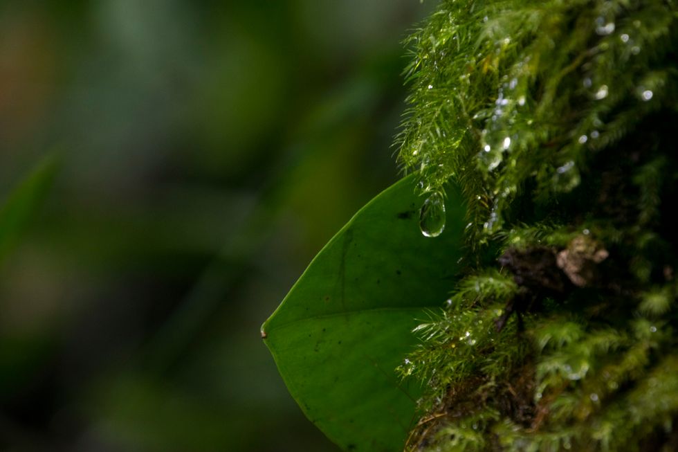 Because of the canopy of leaves above, the trail was relatively dark and shady. Mud tends to stay around for a while, and water droplets like this one are often caught by plants and held, evaporating slowly enough to keep the air very humid.