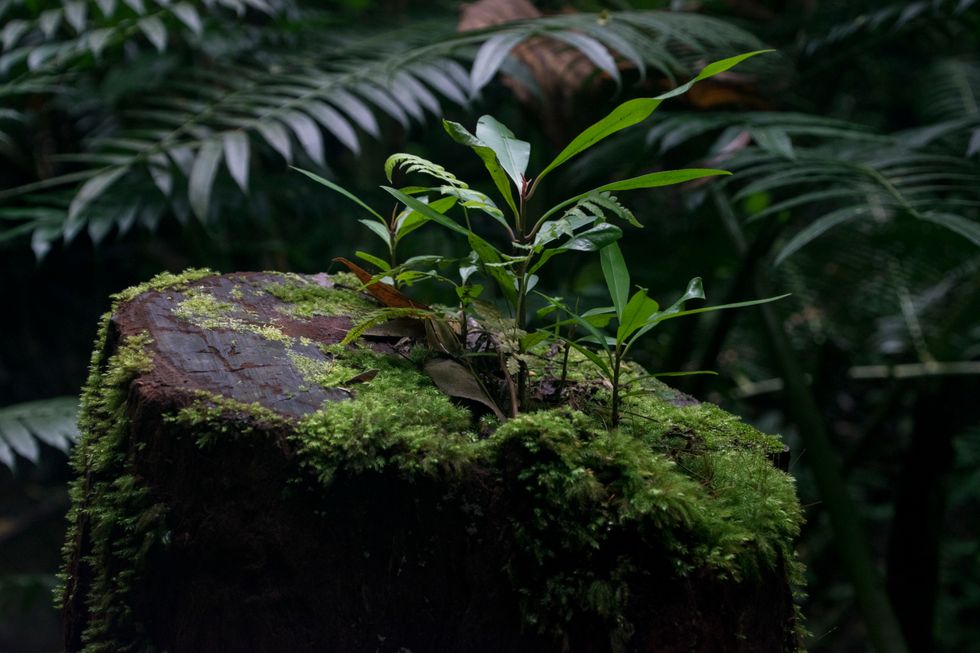 Many felled trees have sprouts growing out of them, speaking to the resiliency of trees. If the sprouts seen here are the tree re-growing itself (sometimes other plants leech the nutrients instead) the roots will likely grow out and completely cover the original stump.