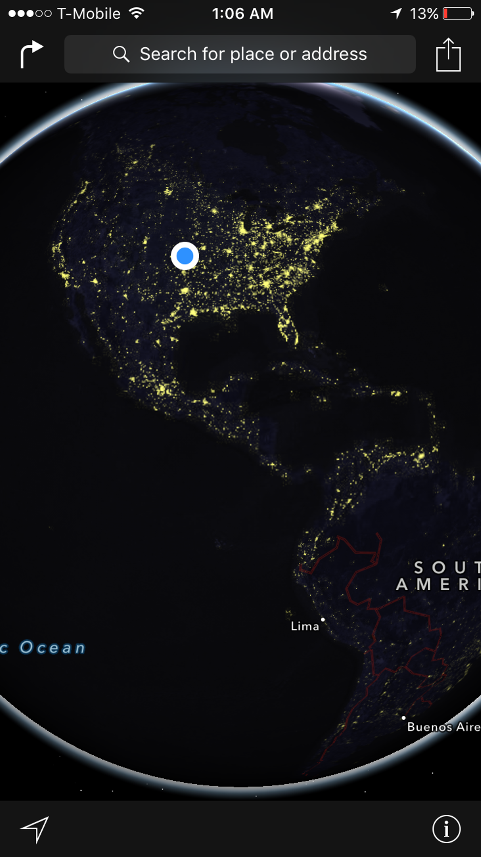 The other night, I decided to visit one of my favorite apps on my phone: the map. I had originally intended to use the app to locate a park in Kansas City, but I then proceeded to explore the rest of Kansas with it. Somehow I ended up in Australia, and I ended up pressing a button which enabled a satellite view of the world. Since I was viewing this at midnight, my map showed half of the world in darkness with the exception of city lights.