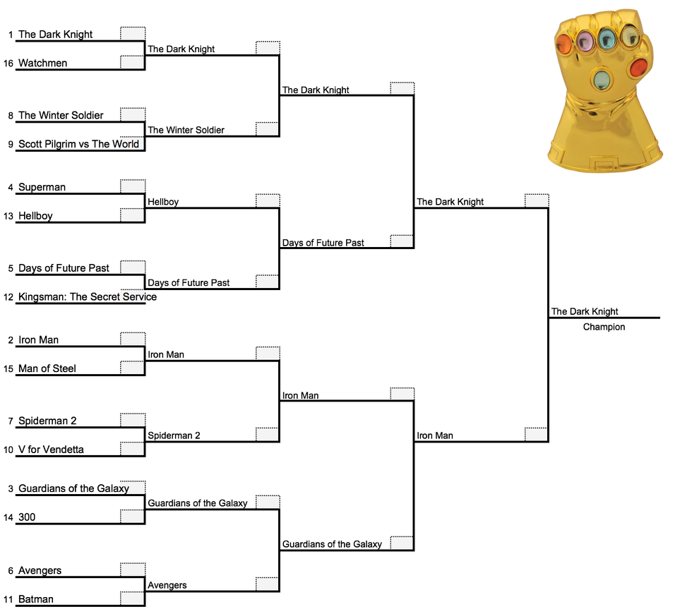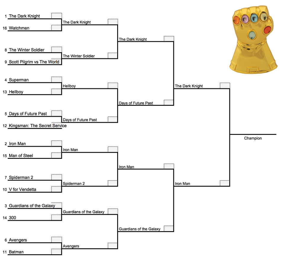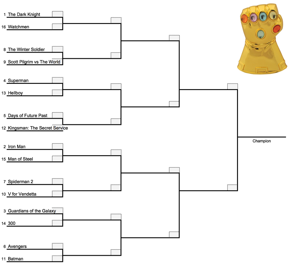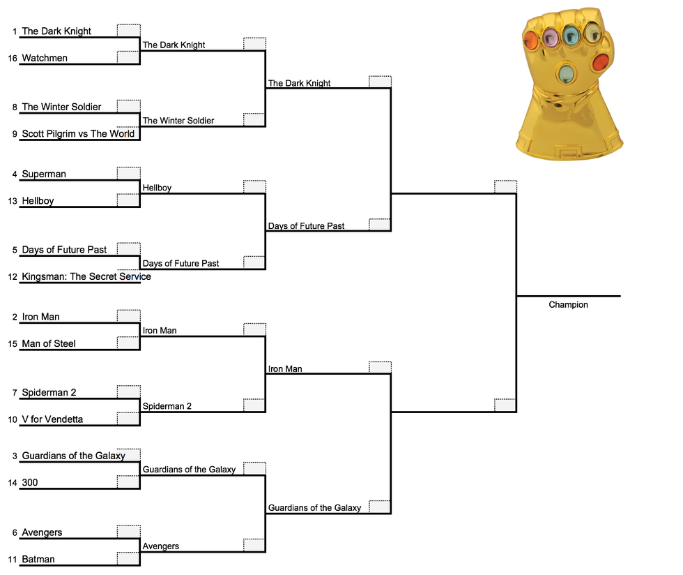 In the spirit of March Madness and the comic book movies which feature our favorite heroes facing off soon to be released I decided to change it up a bit and have a tournament for comic book movies themselves. I started off by typing up the 16 best comic book movies I could think of excluding prequels and sequels that focus on the same characters. In order to keep it a mix of personal bias and objective public perception I averaged their Metacritic, Rotten Tomatoes, IMDB, and Flixster scores together to seed them in a bracket.