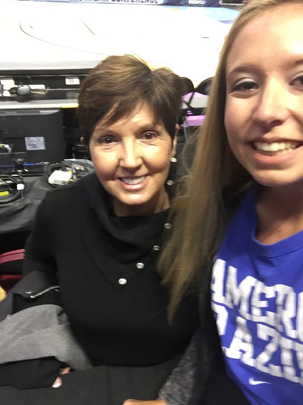 Another thing that people might not realize, is it is not just the teams that are practicing during an open practice. They have mascots, cheerleaders, band, video, audio, whistle-blowers, buzzer-pressers, photographers and shot-clock keepers all there practicing too. They are not messing around. I watched them test official whistles, and I kid you not they did about 5 test rounds for those. And then they tested every length of buzzer possible, including some sort of 30 second long buzzer that I cant imagine would be used unless Grayson Allen tripped someone into a coma. Honestly, it was headache inducing by the end of it. The people applauded at the end. Open practices are weird. Basketball fans are weird. But boy are basketball fans nice! Or maybe it is just Duke fans, but the people around the arena were so polite and helpful; it was quite the atmosphere. Speaking of helpful, I had the wonderful opportunity to meet Mrs. Kryzezewski and the woman helped me climb over a row of chairs so I could take a selfie with her. She said Coach K’s back was doing well and they couldn't wait for the madness to begin. (Side note: The Kryzezewski’s are team iPhone so the jury has made its verdict.)