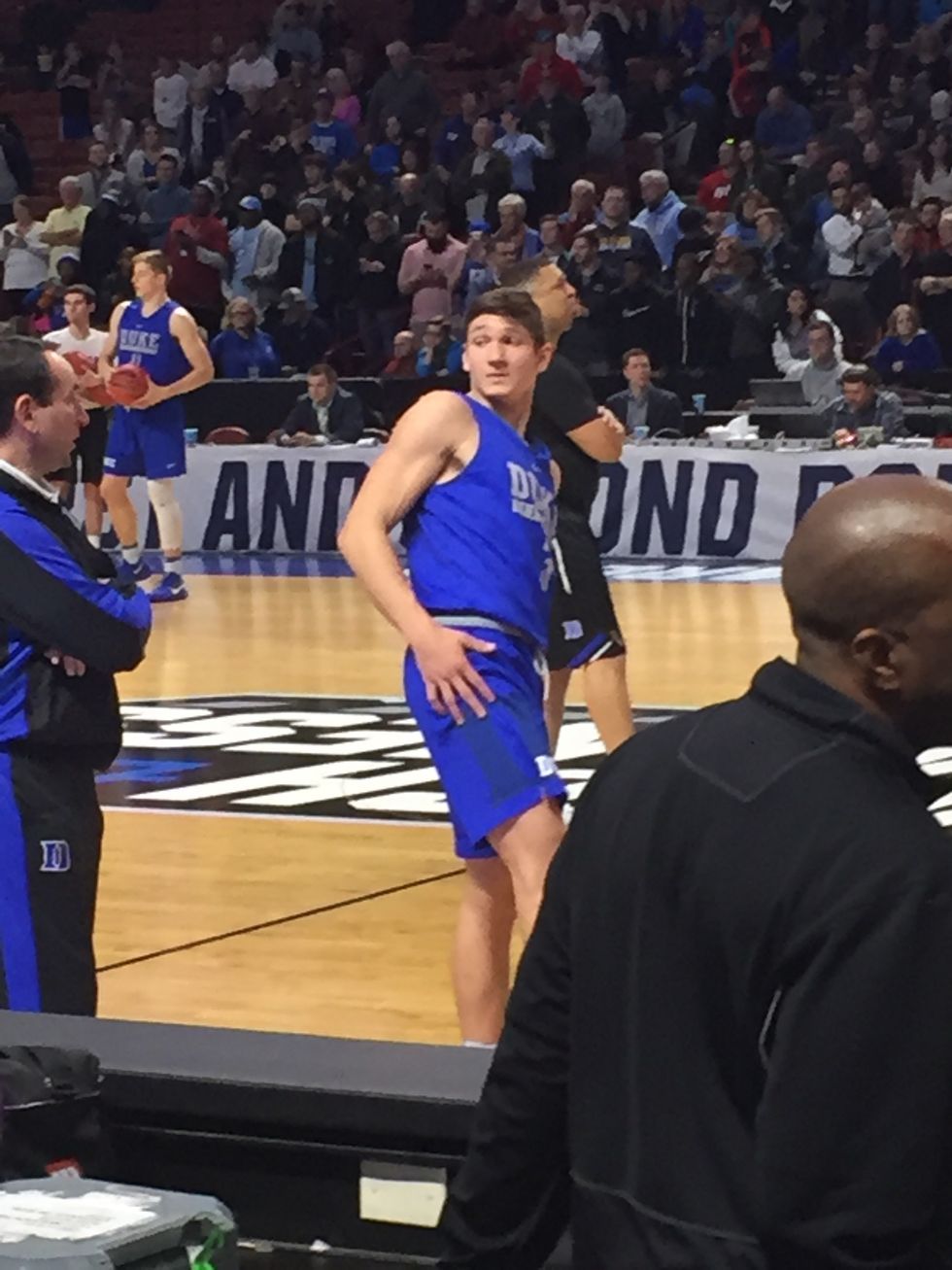 After the almighty Duke basketball team finished their presser, they took the stage…er…the court. Everyone applauded. Coach K looked like the greatest basketball coach of all time would look. All black Duke track suit. His assistants in gym shorts and tucked in T-shirts (of course) and the Duke boys in practice unis that rivaled most school’s game unis. I still didn't know what to expect from by-the-book Coach K in a practice that had higher attendance than some state championships. But it started out like any other practice I’ve seen or been a part of; the boys did line stretches, then static stretches. This is when I realized Luke Kennard is the smiley-est player I’ve ever seen. If I learned anything from this practice, it’s that if you ever need a new favorite player, Luke Kennard just seems like a really cool, deserving dude. My man was dancing and jumping around and high-fiving everyone- but not in that douchey showboat kind of way, just in a genuinely happy-to-be-there sort of way. When it came to the practice itself, the boys had an instinct as to what they needed to do and how long they needed to do it. The event ran as a normal practice, as if there weren't people screaming their names and applauding their slack practice shots. They ran drills and the boys hustled real well. Almost every shot they took, contested or not, went in.The team was super supportive of each other, they lost their mind when Harry Giles dove and sacrificed his body for a ball. It was really great chemistry, I mean they never knocked each other’s balls out of the hoop, didn't look uncoordinated, they just really seemed to really be comfortable with one another. Not to mention, you could tell they were absolutely thrilled to be around Duke Nation.