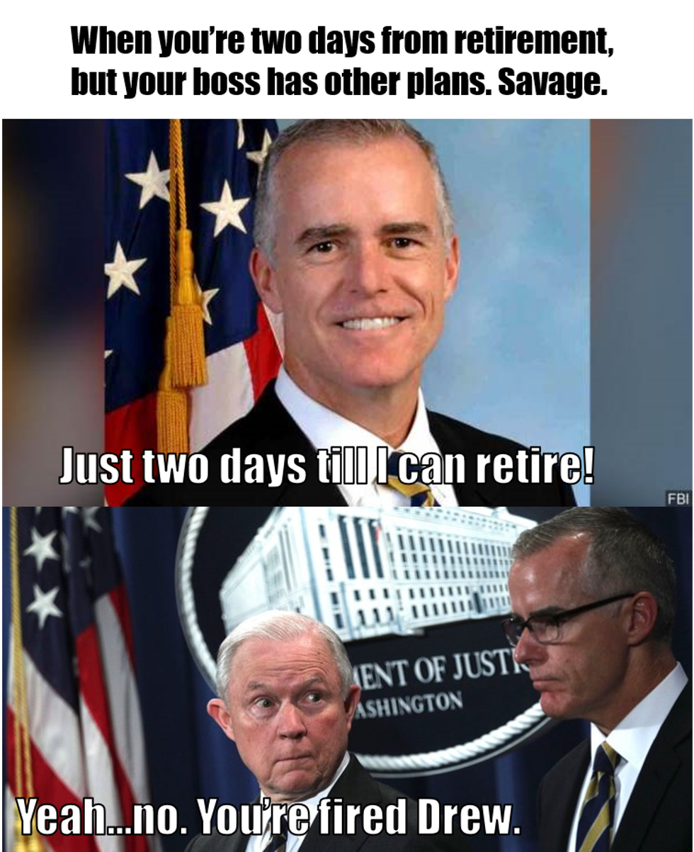 He fired the FBI Director, likely in an attempt to save his own skin, after Andrew McCabe authorized a criminal probe of him. But the timing of this move by Sessions was too hilariously savage to ignore.