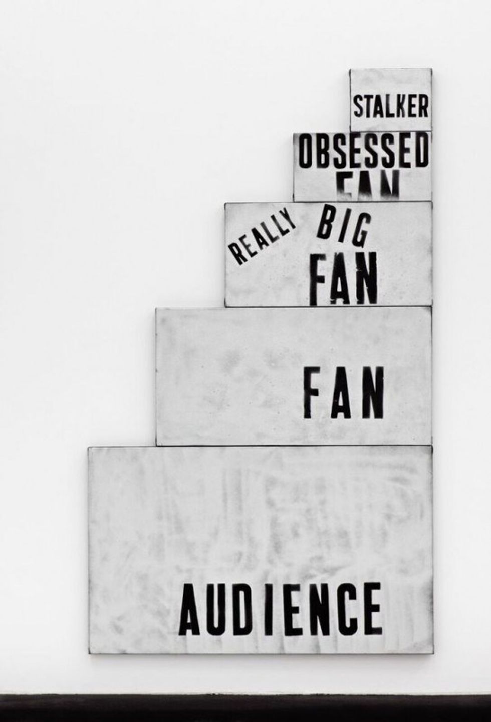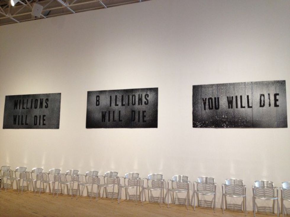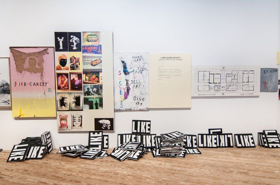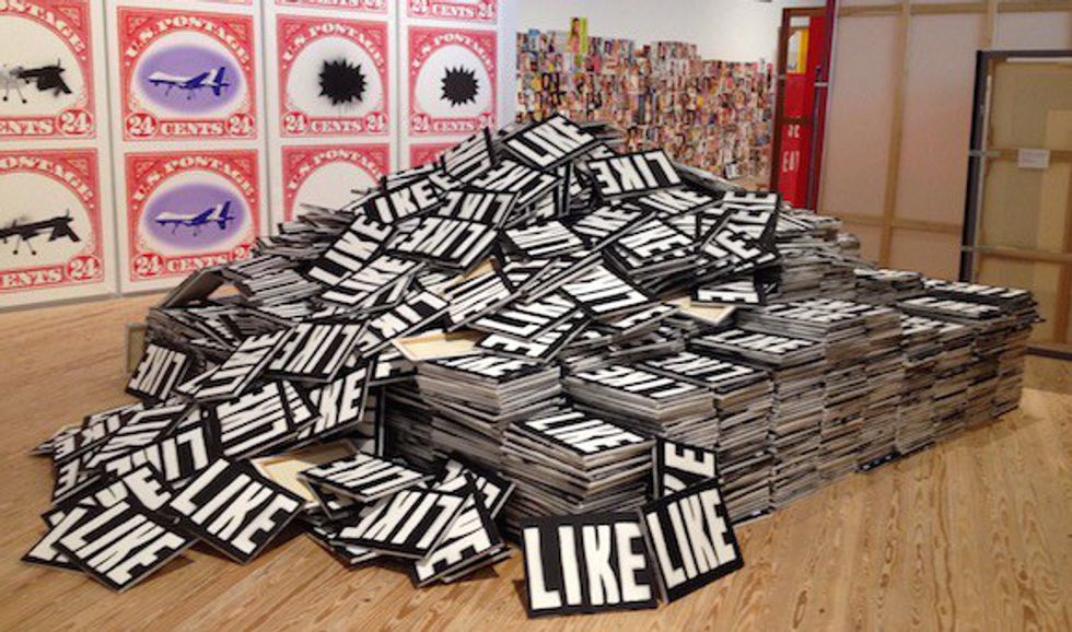 Because the pieces span such a long period of time in the local Houston artist's career, they vary in overall message, but many of the works present a dark perspective on modern pop culture, the art world, consumerism, and development of social media. Right at the start, the room is filled with 5,000 black and white paintings that both symbolize and mock the incessant need to selectively or generously provide others with our approval. Beyond that though, the "like" is fascinating because it's providing approval and opinion without actually having to engage. Some might say it enhances human interactions, but others might say it inhibits. These small canvases (pictured below) are available for the viewer to move and place in front of the works within the space that they most enjoyed. The interactivity of the exhibit was fun and engaging, but also appropriately represented and satirized this aspect of social media.