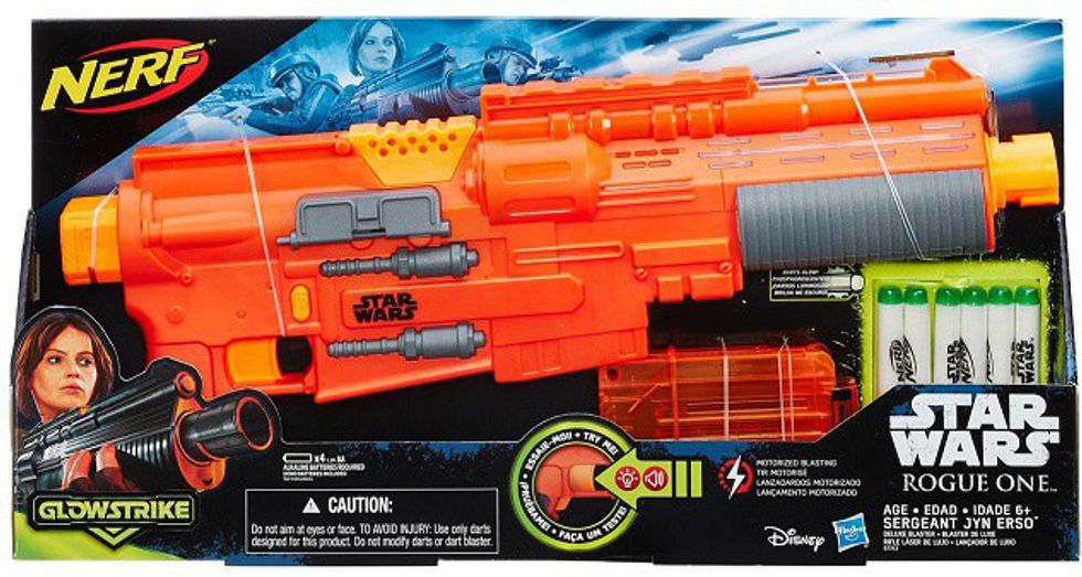 The box’s label also names her “Sergeant Jyn Erso” rather than just her name, something that pays a great respect to her vastly integral role in the film and avoids belittling her in any way. The blaster itself is orange, not pink, and appeals to both boys and girls. This is in direct contrast with Nerf’s “Rebelle” line, for Jyn is made to look tough, mean, and focused, a behavior and attitude previously only reserved for men in advertising.