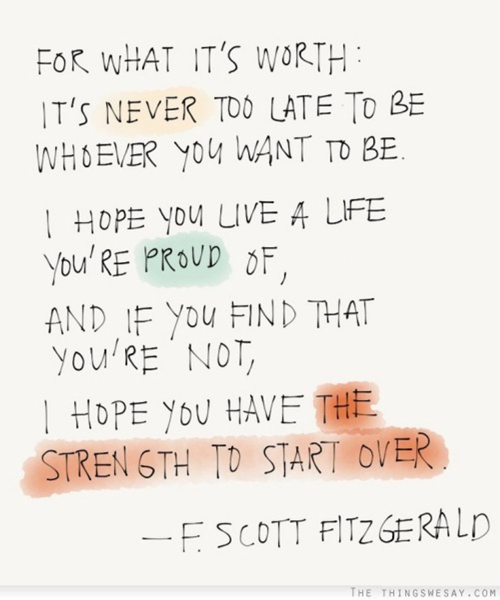 "For what it's worth: It's never too late to be whoever you want to be. I hope you live a life you're proud of, and if you find that you're not, I hope you have the strength to start over." -F. Scott Fitzgerald