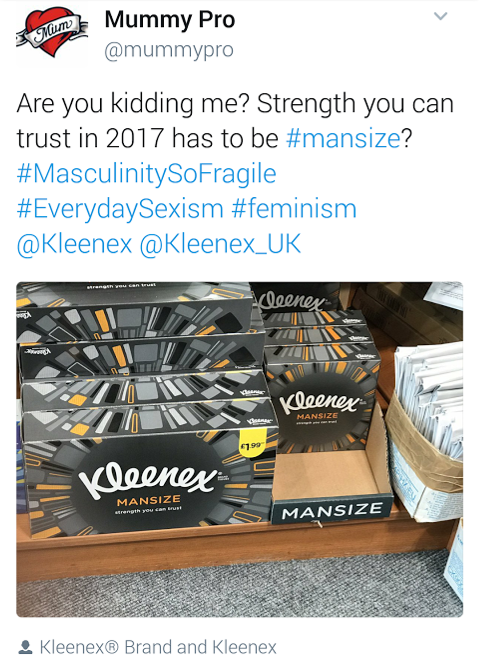 Of course, the things that do say “for men” on the packaging are, for the most part, ridiculous. A “mansize” box of Kleenex and “meggings” are unjustifiable in their marketing strategy. A “large” box of Kleenex and leggings in all sizes will suffice.