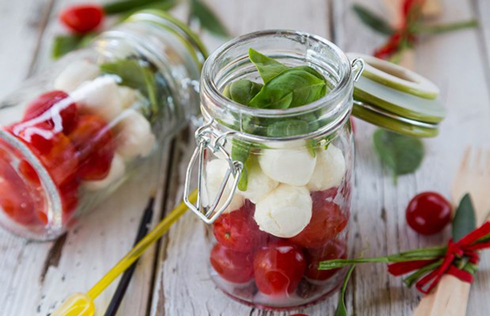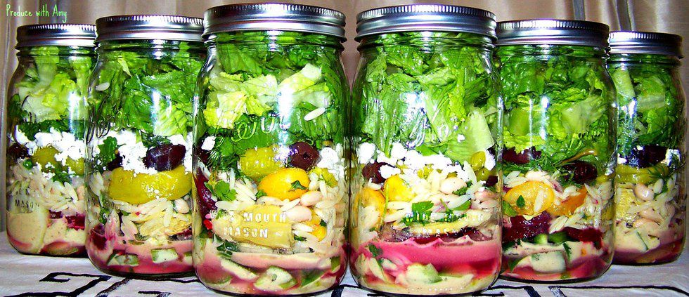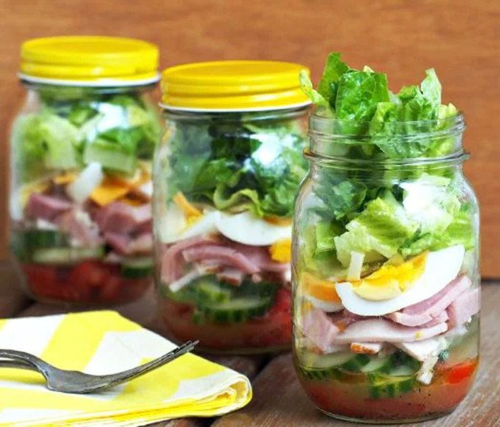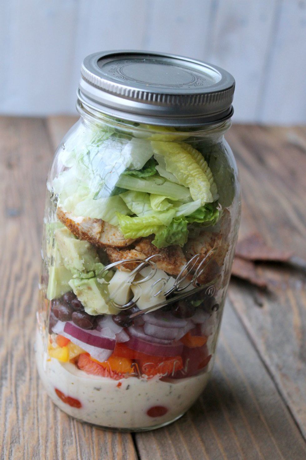 For a salad with a bold flavor, try this southwestern recipe. Ranch dressing, sour cream, or even plain Greek yogurt are all suitable to sit at the bottom of the jar. Chop up red, yellow, and orange peppers along with a red onion and corn to serve as the non-absorbent vegetables. Next, add a layer of black beans, avocado pieces, and diced chicken breast. Just fill the rest of the space with iceberg lettuce and you will have a jar filled with zesty goodness.