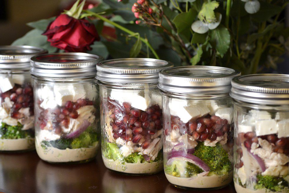 To make the dressing for a week's worth of jars, mix a cup and a half mayo with half a cup of balsamic vinegar. Fill the next layer with broccoli florets and onion slices. Pieces of chicken breast come next, followed by the addition of pomegranate seeds for a sweet crunch. Cubed goat cheese rests on top of this tasty salad.