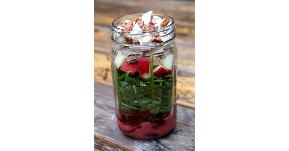 Start off this jar salad by making a strawberry vinaigrette which includes two cups of strawberries, two tablespoons balsamic vinegar, one tablespoon red wine vinegar, one tablespoon lemon juice, one garlic clove, and one fourth teaspoon dijon mustard. Next, add a layer of sliced beets, followed by a handful of spinach. Lay the beet slices flat to keep the spinach from touching the strawberry vinaigrette. Chopped apple pieces, chicken chunks, and walnuts top off this sweet beet chicken salad.