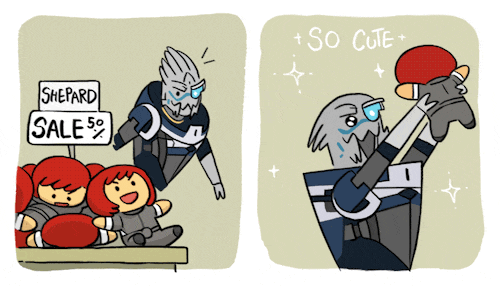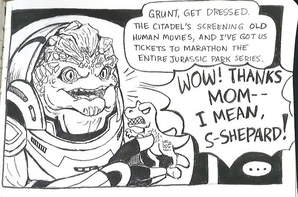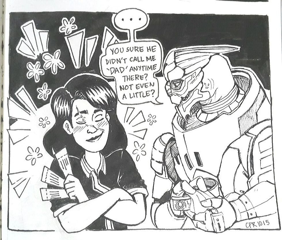 I ship Shepard, Garrus, and Grunt as a little family harder than I ship any other ship. Also, this comic shows Garrus with his visor off, which I love seeing because he never takes it off. I mean, he barely ever exchanges the armor for regular clothes. But still. One can dream.