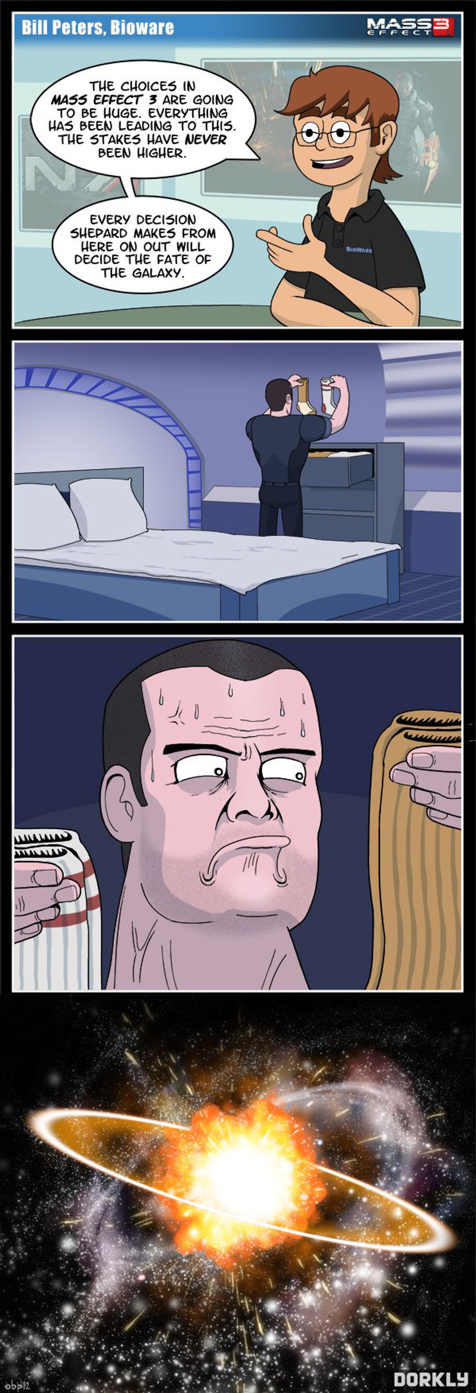 This has been one of my favorites for a long time (as in, "saved-in-the-Mass-Effect-folder-on-my-laptop" favorite). Because all of your choices really did matter in the end. Not.