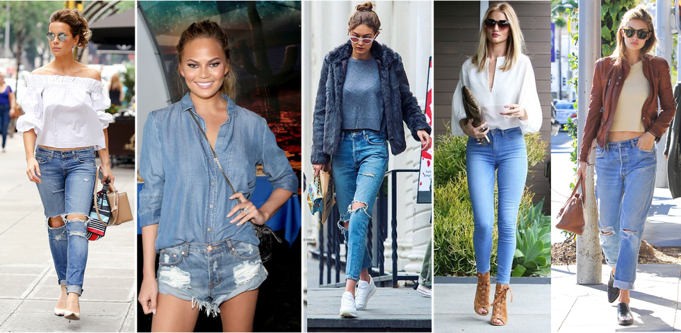 Granted, some distressed denim looks like Jack the Ripper got a hold of them and went too crazy- but overall I think that these styles can be tasteful and styled to give an edginess to your weekend look or even for a night out outfit. Above, you can see how celebs pair their neutral tops with light-wash and distressed jeans of all cuts and pair them with shoes that complement the color scheme of the denim, usually with a white, cream, or brown.