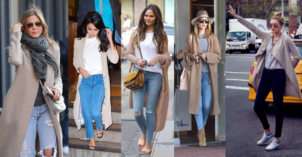 Let's start from the top- literally. A key thing to note in the street-style trend is that in almost every look, celebs opt for a neutral-colored top. Most of the time, the tops are a gray, white or cream, and they fit loosely around their perfectly-toned frames but sometimes we see celebs mixing it up with a tight black or navy top. Depending on the location or the season, the materials of these tops can vary from a thin cotton to a heavy knit sweater.