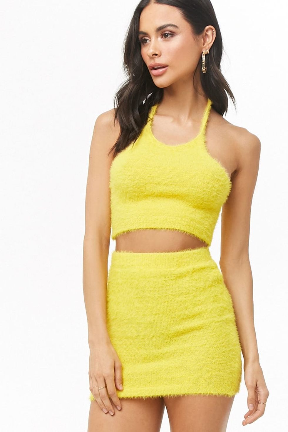 Who said you have to give up soft and fuzzy clothing for the summer? Not me! If you're still on the hunt for festival outfits, make sure you add this all-yellow combo to your shopping cart. (Early) Halloween costume tip: recycle the look to recreate an adorable Big Bird costume.