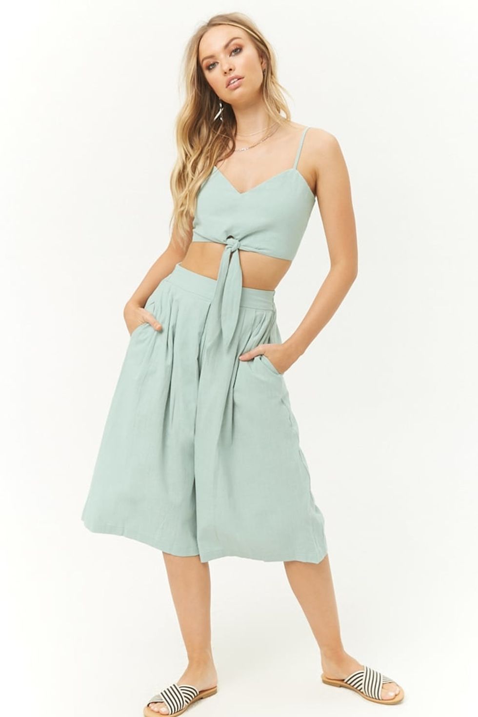 It looks like baggy pants aren't going nonexistent again anytime soon (our worn-out skinny pants are shaking). The culottes with the self-tie top look so sophisticated, yet so cute, especially in this pale green color.