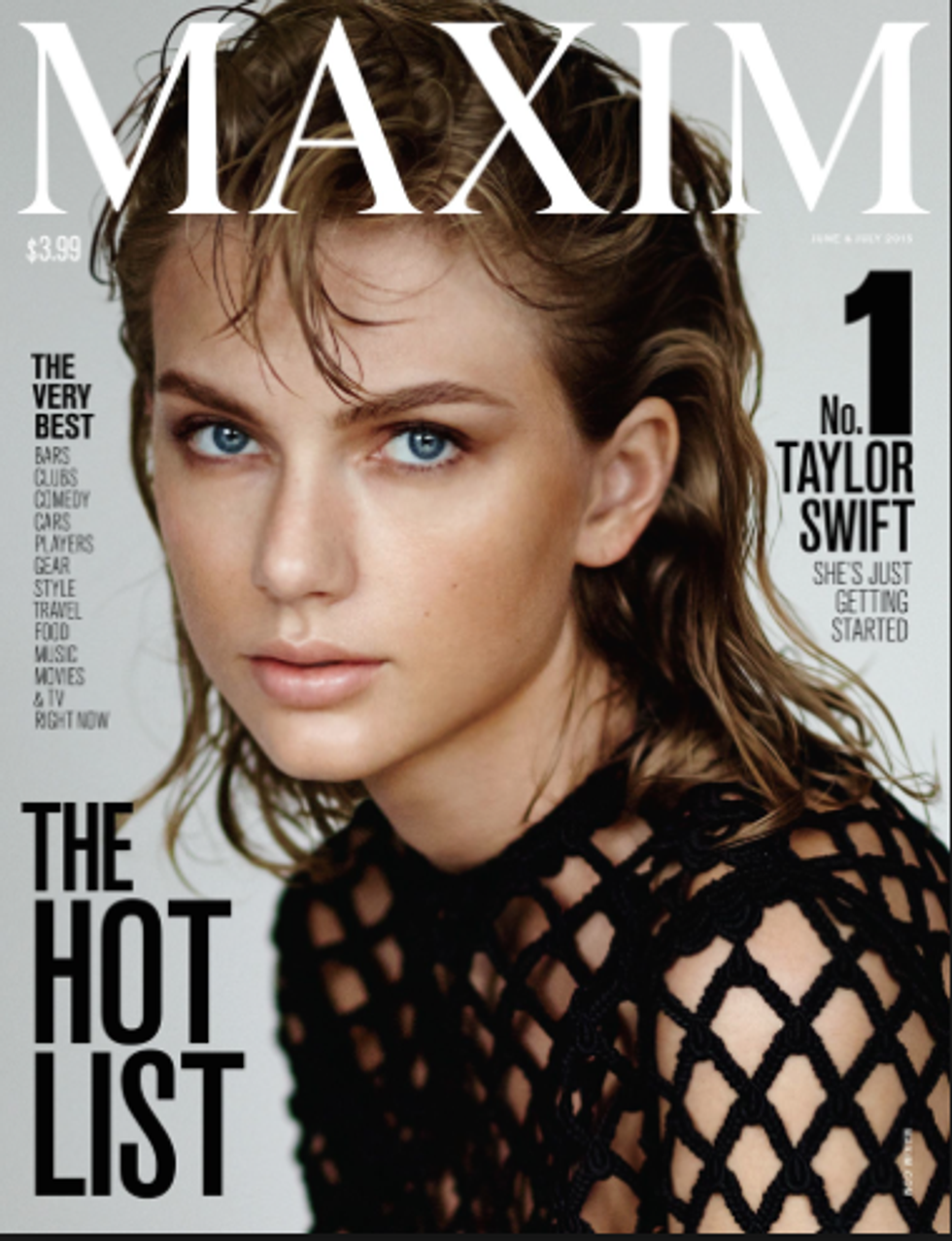 Other issues of Maxim under Lanphear’s guidance demonstrate the same focus on as Lanphear calls it, “authentic” and “raw” beauty. There is the edgy, upside down photo of Charli XCX on the May 2015 issue, and then the July issue that features Taylor Swift, sans legs and breasts, her bright blue eyes striking and intriguing. Swift, who has achieved an enormous amount of success as an artist in the past couple of years, was crowned Maxim’s hottest woman, showcasing to the world that a woman can be more than merely a sex symbol in order to be deemed “hot.” Lanpear’s shift away from the previous, highly sexified photos of women that Maxim was so well-known for is an effort to make the magazine not only more esteemed, but also women-friendly. The change is, in my opinion, a smart move, as appealing to a larger audience (both women and men) can indeed help to improve sales and readership of the magazine. While most women still don't look like Swanepoel or Swift, I like how Lanphear is moving away from the unrealistic, almost cartoonish images of half-nude women that once characterized the magazine, to more natural and unaltered images of women.