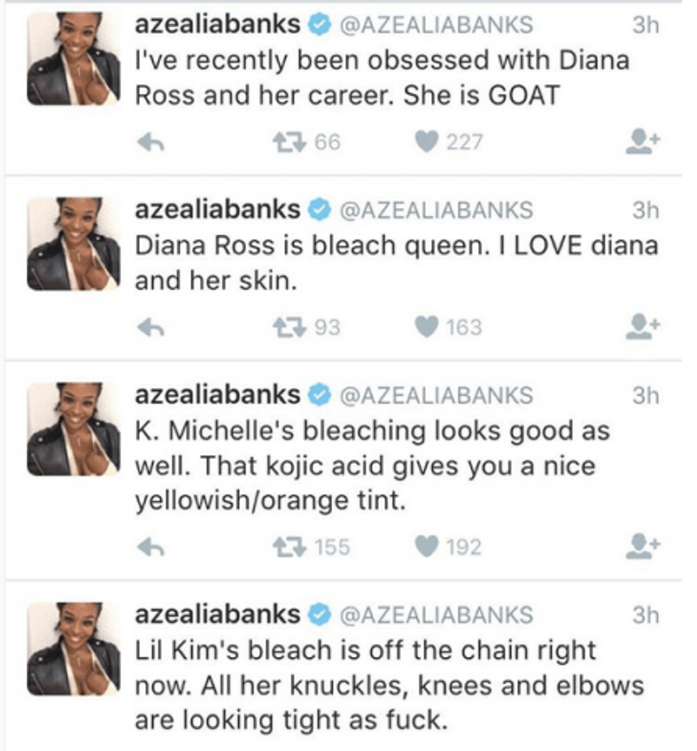 Last year, she posted a string of tweets commending Diana Ross, Lil Kim, and K. Michelle on their skin bleaching efforts. She also admitted that it was depressing seeing lighter women with worse music than her advance and that being a dark skinned black female made her want to “lay down and die.” I would be lying if I said I too have never felt that way.