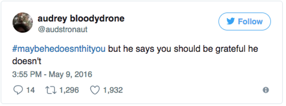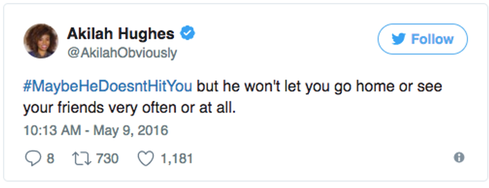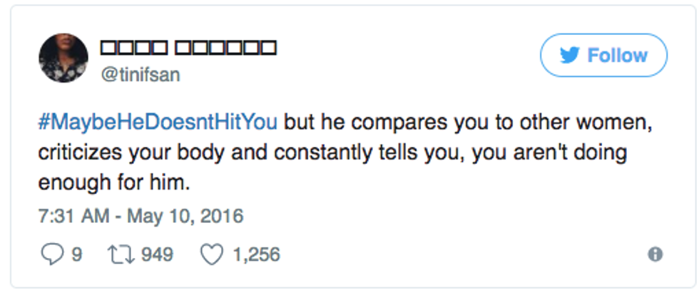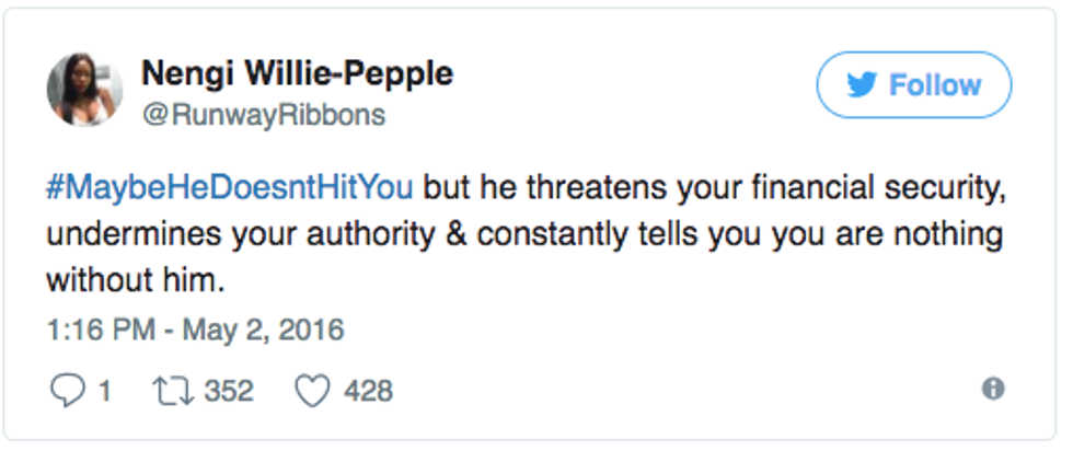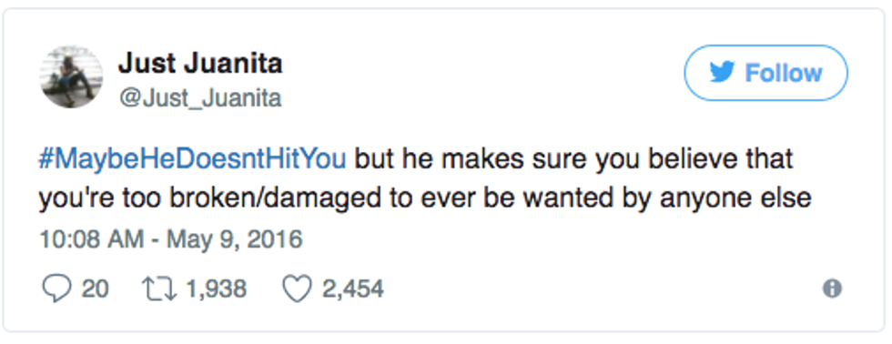 In 2016, there was a major Twitter trend with the hashtag #MaybeHeDoesntHitYou. This hashtag allowed many women to share their personal stories of abusive and horrible relationships even though there was no physical harm.
