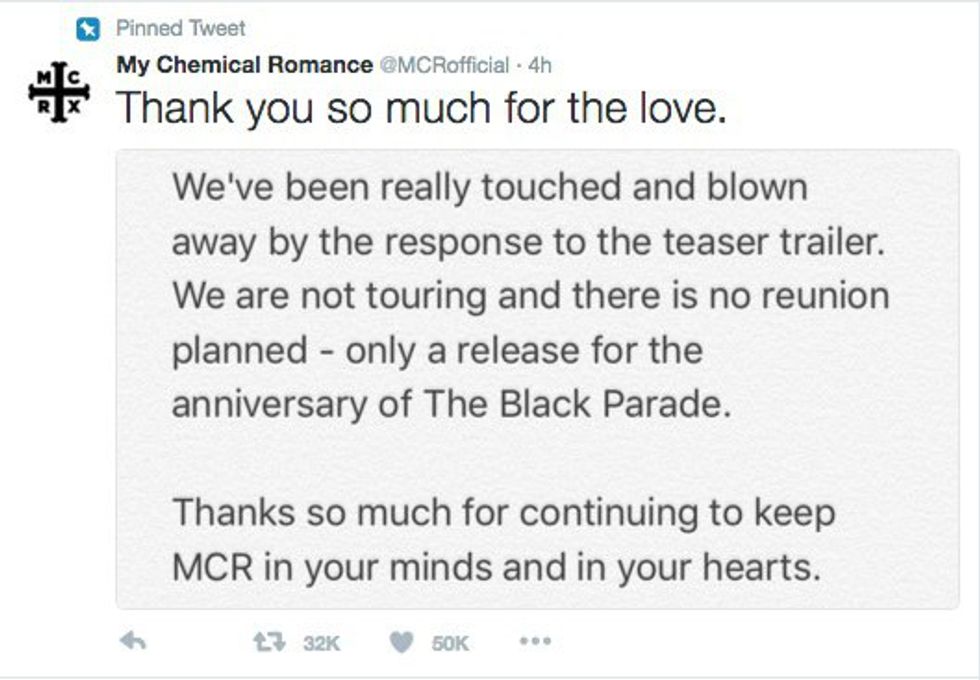 All this says to me is that MCR is over for good and that I was partially right that this would be something for the 10-year anniversary. I just thought, since "TBP" meant so much to so many people, it would be a bit bigger. In conclusion: we can officially add this to the list of why 2016 is one big disappointment.