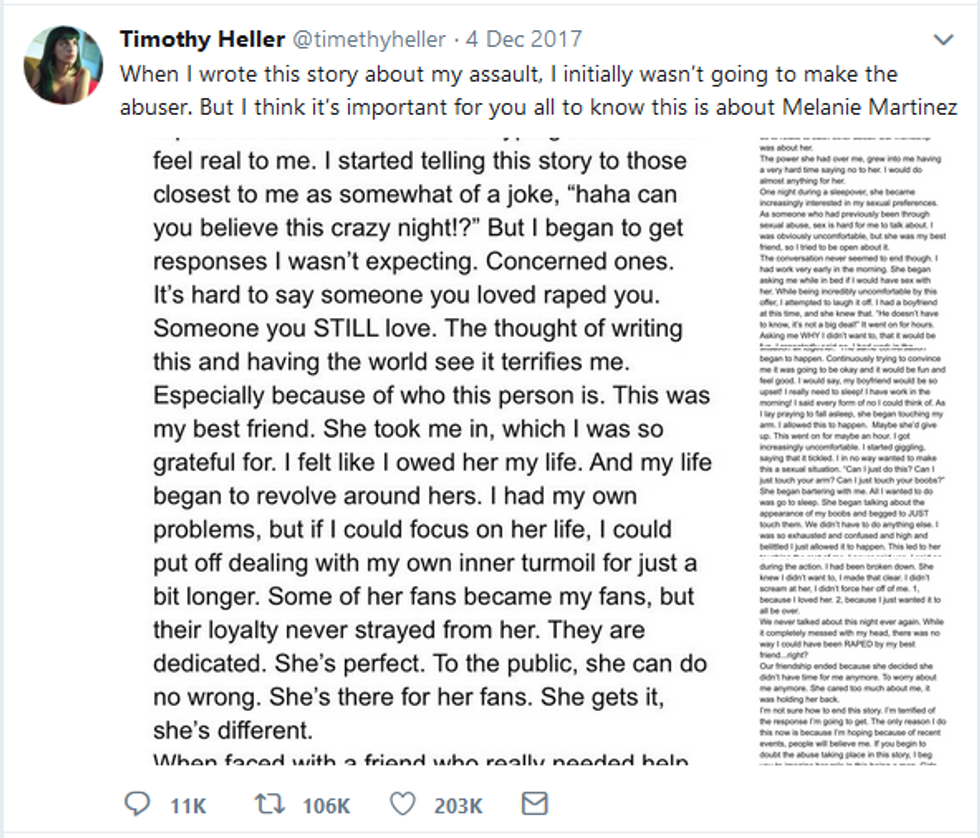 Prior to "Grace's" story being published, in December of 2017, a post on Twitter went viral. The post accused popular pop artist, Melanie Martinez, of rape and was written by her best friend and fellow female musician, Timothy Heller.
