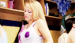 In the very beginning of the movie. Regina is spotted being carried out by a group of boys in gym class. She is pretty much royalty at that point. She's wearing a blue t-shirt and black cheer shorts. Why not make your guy friends pick you up for a perfect picture opp.