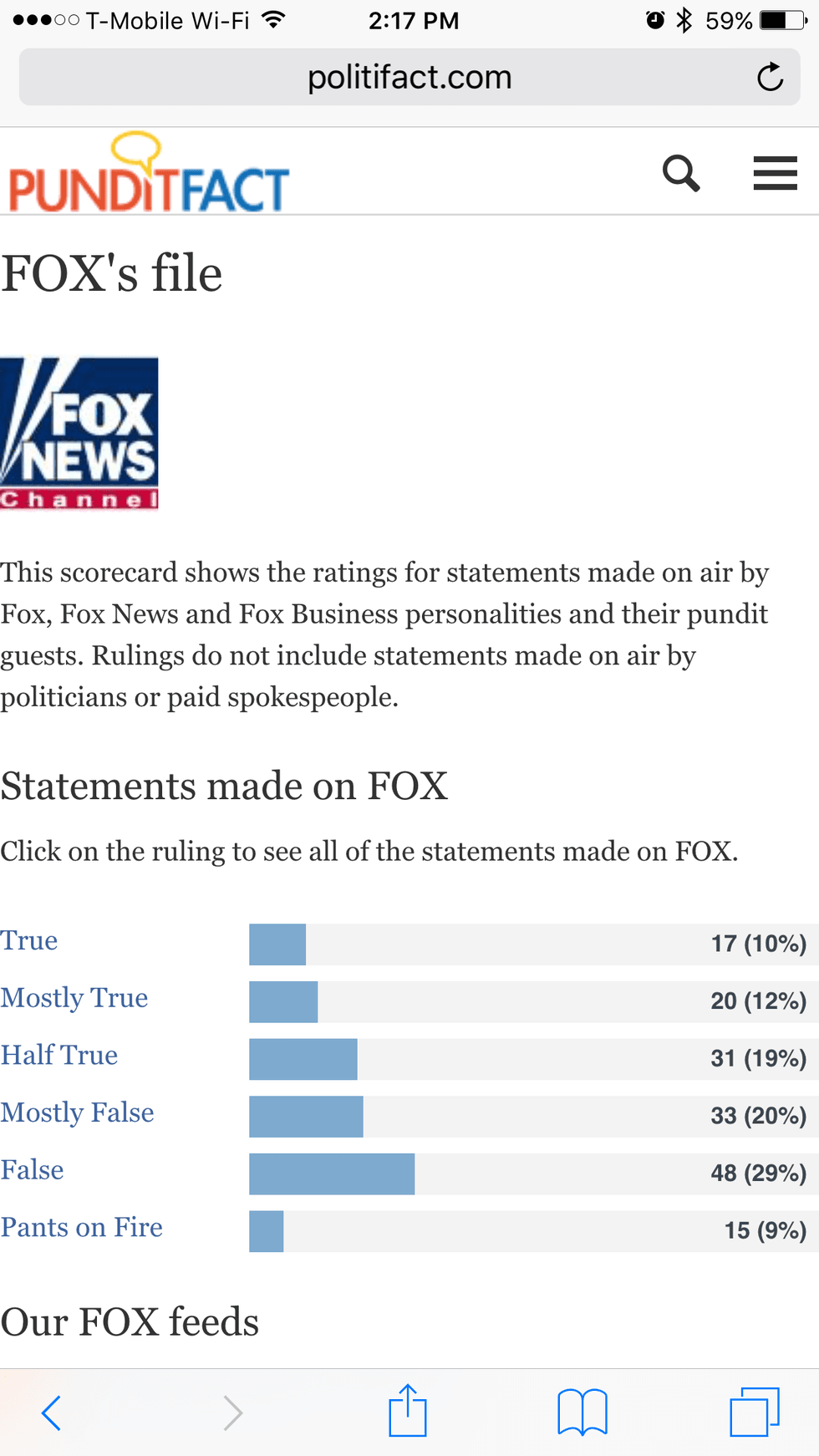 For example, Fox News has been questioned for years of their true newsworthiness. According to politifact.com, here are the percentages of statements made on FOX ranging from true through false and the numbers are surprisingly higher on one end of the spectrum than the other (http://www.politifact.com/punditfact/tv/fox/).