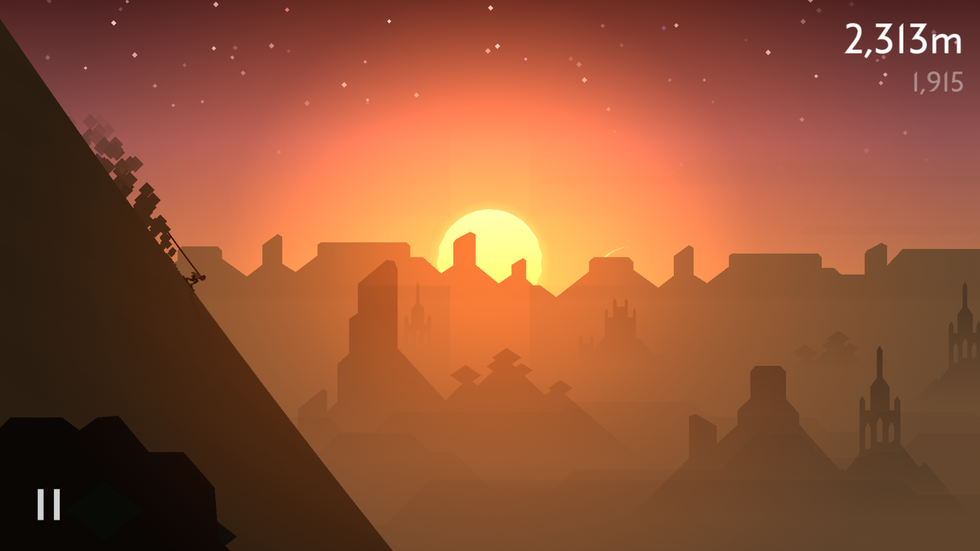 After a brief reflection on the newest Monument Valley installment, I was recently introduced to another mesmerizing mobile phone game: Alto's Odyssey. It's actually a follow-up to another Team Alto release, Alto's Adventure -- a collaboration between Canadian studio Snowman and lead artist/programmer Harry Nesbitt -- but my entrance to the series starts here. I'm discovering that I might have a certain taste for cerebral games; both are minimalist in character design but striking in their color palette and sense of environment (a picture says a thousand words is a pretty apt metaphor here), but that is where the similarities end.