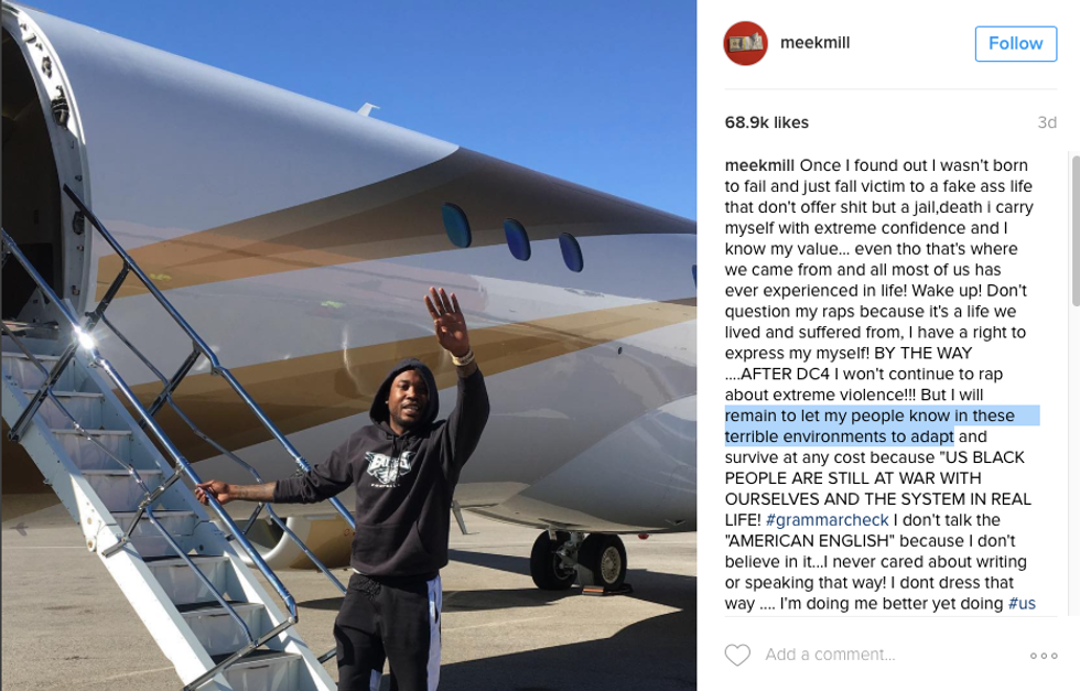 As social media being the grounds for announcements these days, Meek Mill took to Instagram to proclaim that there will be a change to his music; however, he “will remain to let [his] people know in these terrible environments to adapt." Including a rant against the system, the MMG rapper shared his experience with bad cops and wrapped up with a powerful, mind provoking thought: “US BLACK PEOPLE ARE STILL AT WAR WITH OURSELVES AND THE SYSTEM IN REAL LIFE!”