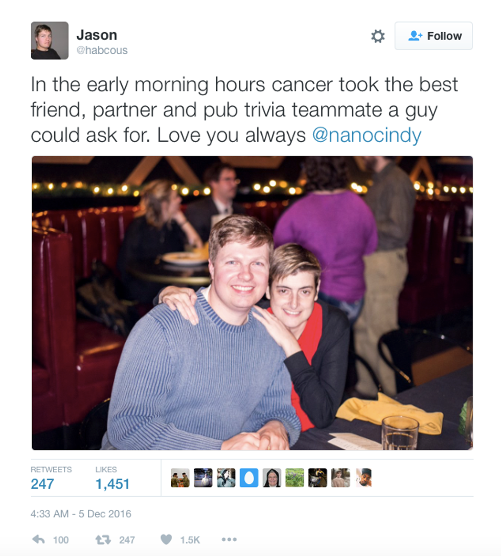 Cindy went on to amass a six day run on the quiz show. Along the way, we got to learn more and more about this science content developer; each nugget of personal information making us love her just a little bit more. She told Alex Trebek and viewers all about her nail polish collection, her affinity for terrible movies, and her ultimate frisbee days. Despite all this information, almost no-one knew about the fever, nausea, or intense abdominal pain that Cindy endured while taping the show.