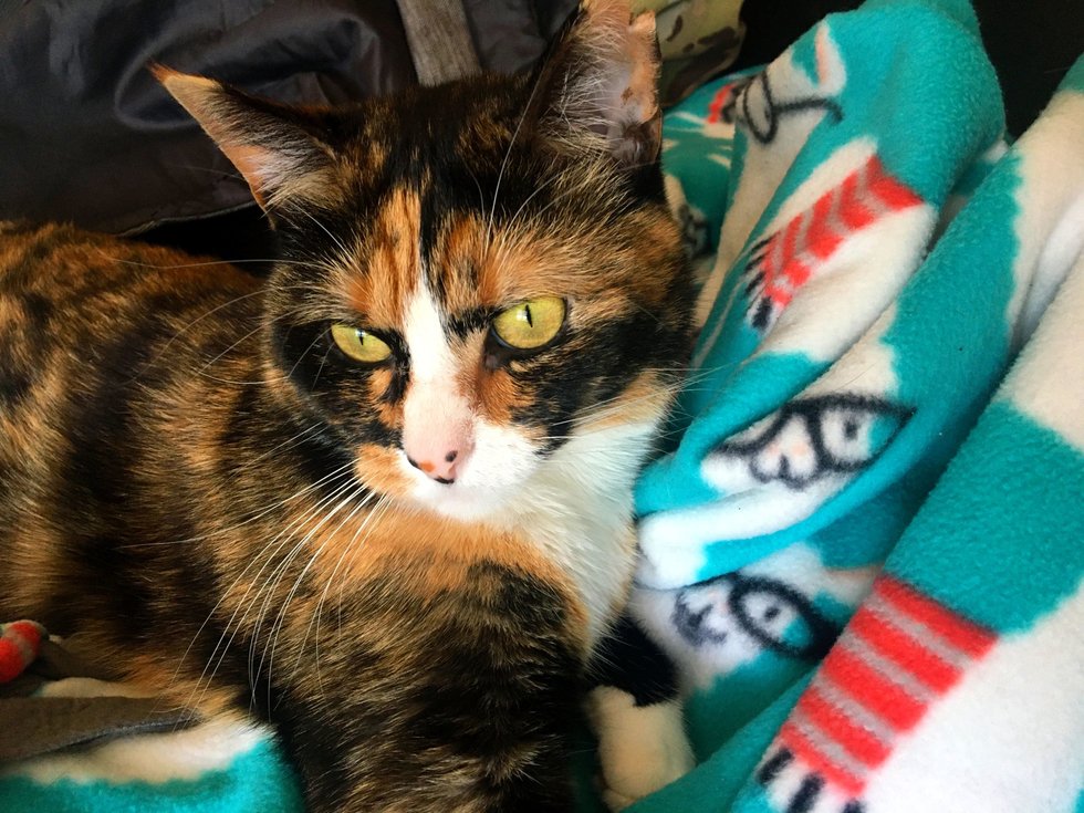 2. She is a calico cat, and even has her colors on her paws and nose! I personally love her little orange dot on her nose.