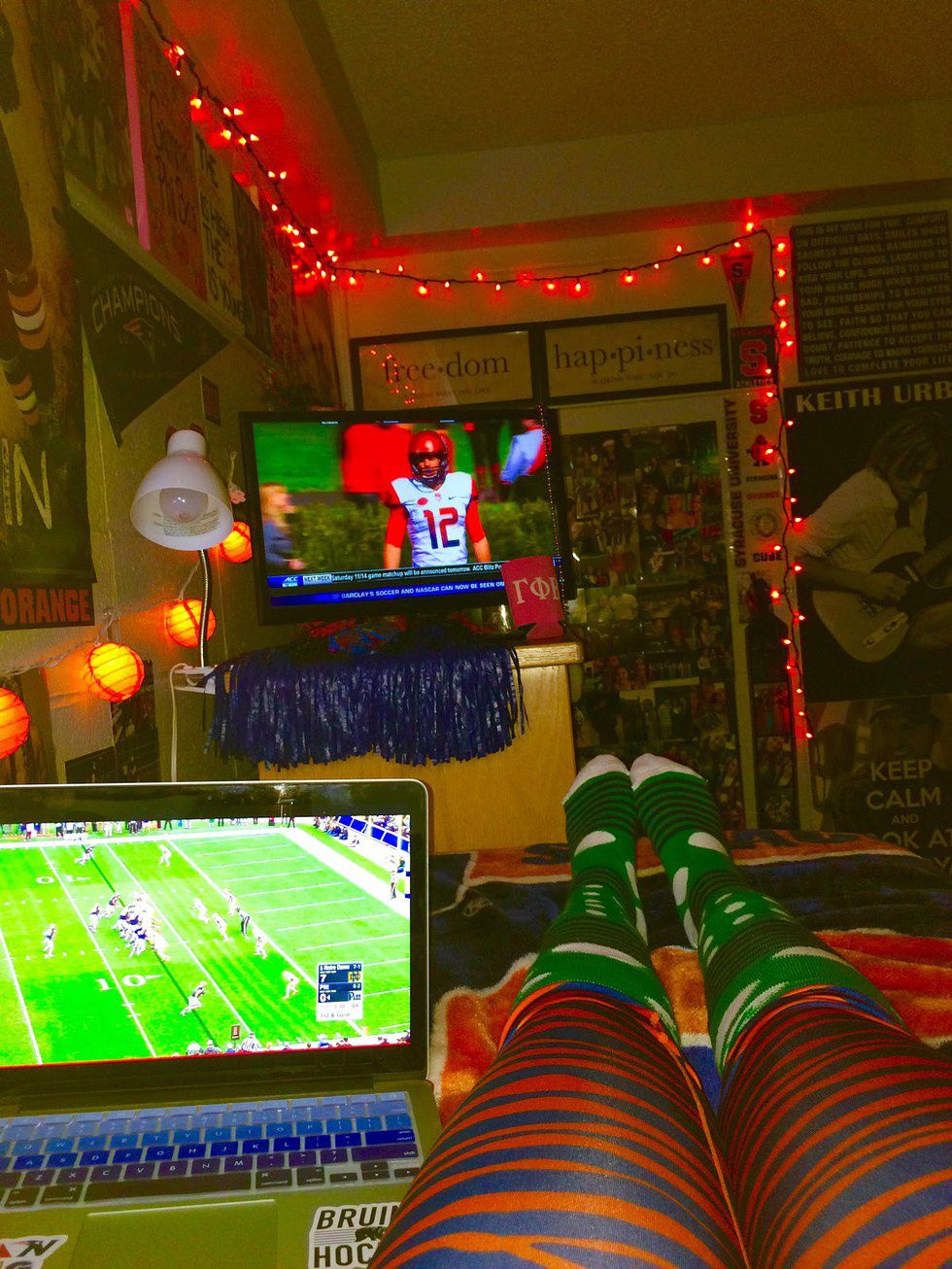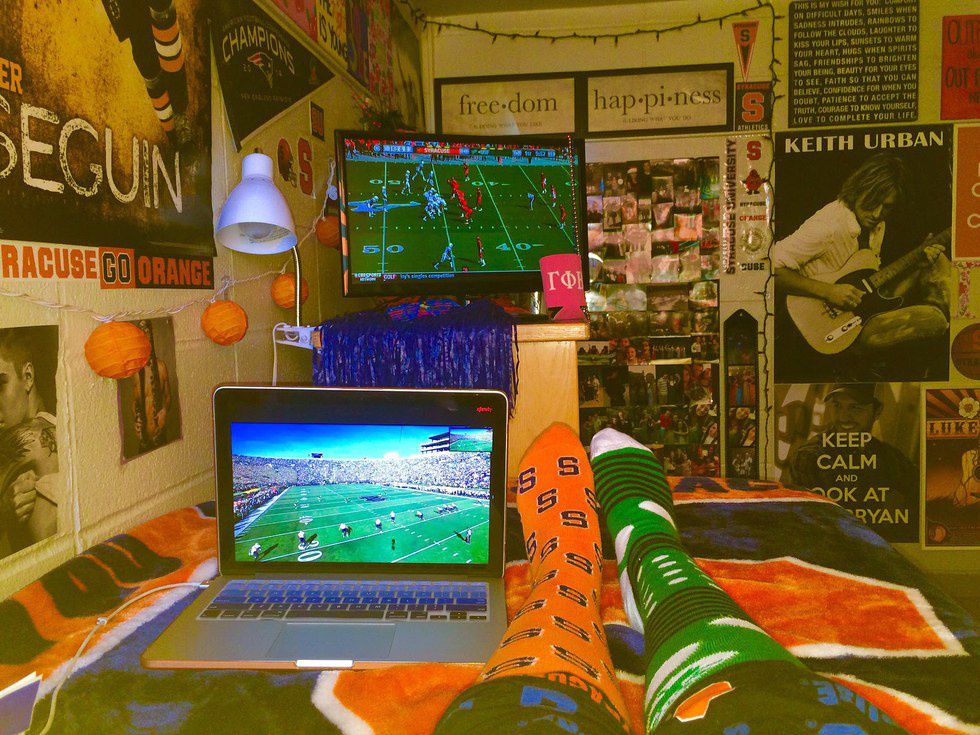 Thing you like to do by yourself: Watch Notre Dame Football on my computer while simultaneously watching Cuse Football away games (when they’re playing at the same time)….while wearing Cuse striped (orange and blue) pants, a Notre Dame sweatshirt, one orange/blue striped sock, and one green shamrock sock. Judge me. Proof on two different occasions (and yes, this is my dorm room):
