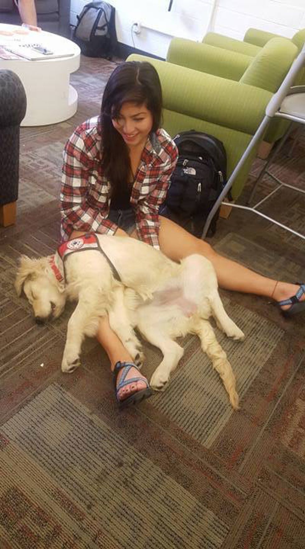 My name is Six and I’m pretty much your average canine, but I’m getting ready to pretty much save the world. I’m a five-month-old purebred golden retriever. I’m a girl, but I’ll steal your girlfriend with a pretty swift wag of my tail. But sorry, ladies- I’m spoken for. I’m watching over my human Becca Makii up here at Ohio State. She’s watching me while I get ready to serve those who need me at 4 Paws for Ability. I repay the favor by taking her for walks everyday, taking her to meet my other super-pup friends from my organization with their humans, making sure the sofa is properly slept on, and making sure that the kibbles she spills every night are properly cleaned up and disposed of. It might be a lot of work walking Becca everyday, but she makes sure I’m wearing my super dog vest and hangs out while I go play with the other pups at the Veteran’s Lounge.