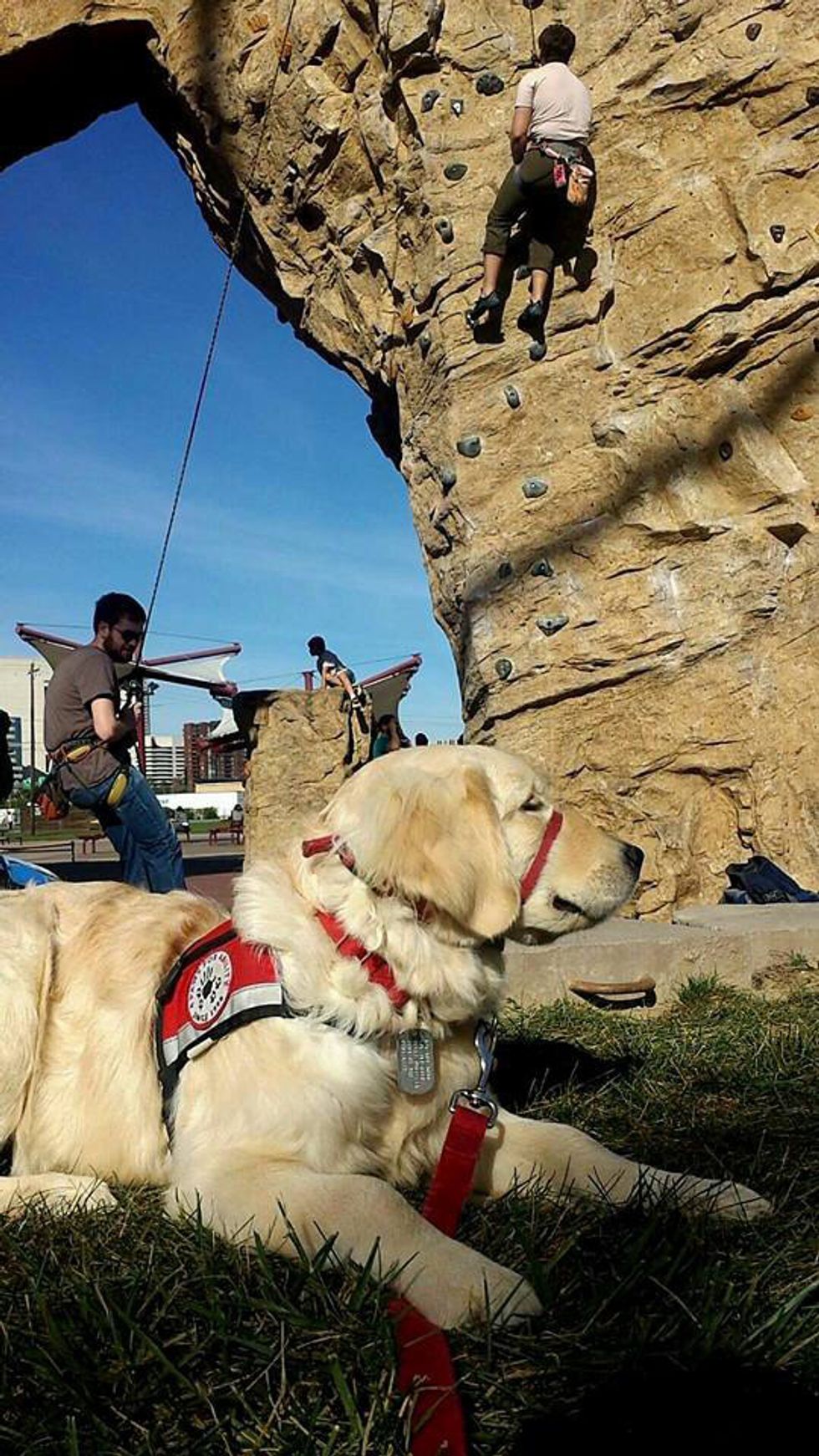 Lemme tell you about the wonderful Becca for a minute though. She told me that a friend of hers approached her last Spring and asked if she was interested in fostering for a service dog organization. Next thing she knows, she’s down at 4 Paws for Ability and I’m getting ready to take her for her first walk. She’s a 4th year student at Ohio State studying pharmaceutical sciences but she’s applying to veterinary schools at places like Ohio, UGA, Michigan State and Texas A&M. Paws crossed on Ohio, cause go Buckeyes. She also digs rock climbing, photography, and her boyfriend Landon she’s been with for two years. He rock climbs, too. Unfortunately, I don’t rock climb. Ya know, no thumbs and all. She’s been a great human to have in this stage of my life while I get ready for the real world. From all the walks I take her on, to the constant attention I give her. She’s helping me get ready for work better than even I could’ve hoped for. Hey, you don’t expect me to be as super as I am with a price tag like this and not be just a little high maintenance? But hey, you may call it a vest- I call it my super cape. You should check out those links below though. 4 Paws for Ability is really, really great and the Veteran’s Lounge I hang out with is just too much fun for all the good the veterans and I do for each other.