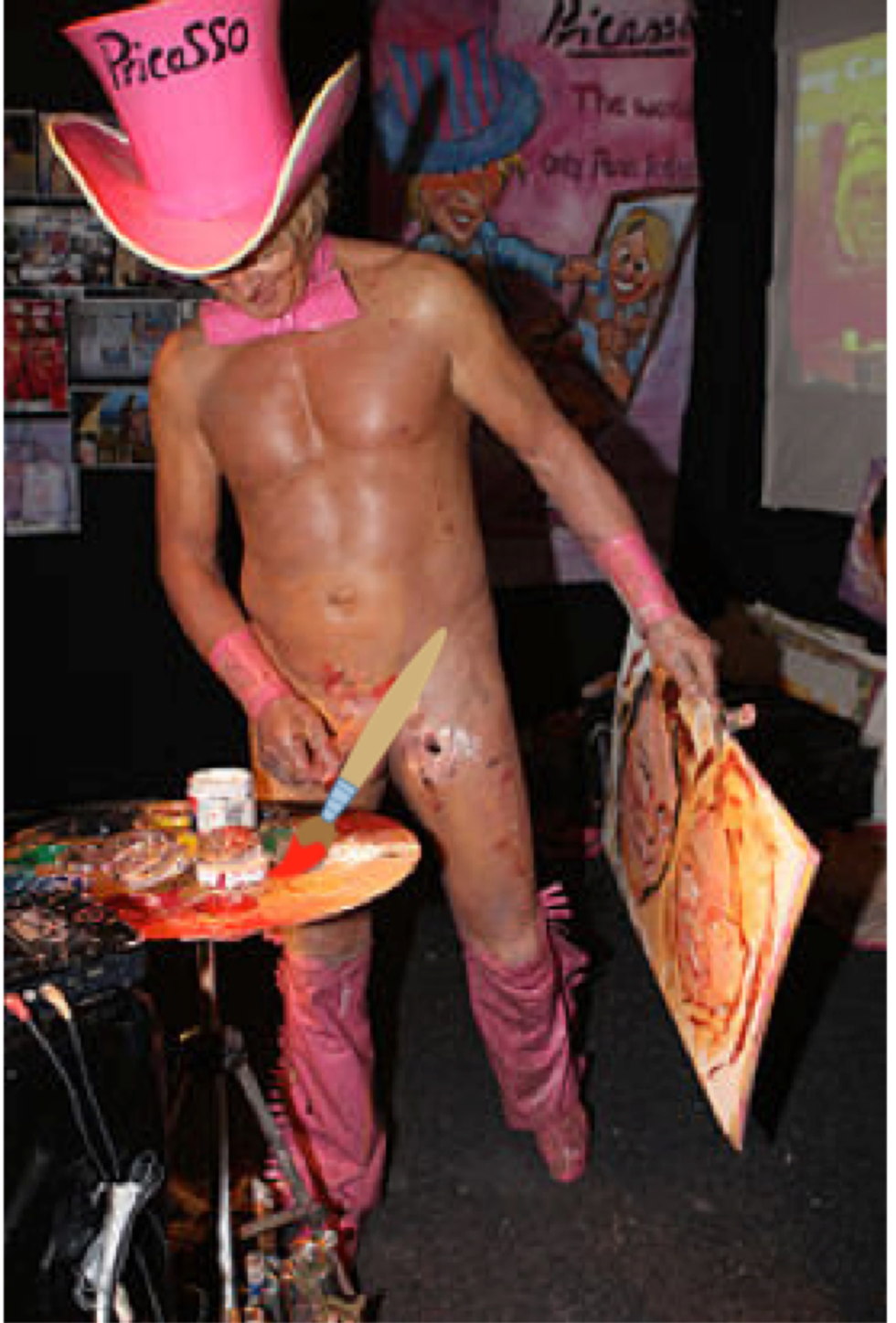 And you know what makes Pricasso so unique? He carries around his paintbrush wherever he goes! Literally. ‘How?’ you may ask. Well, because his paintbrush is his penis. Yep, he paints using his ‘prick.’ Hence the name.