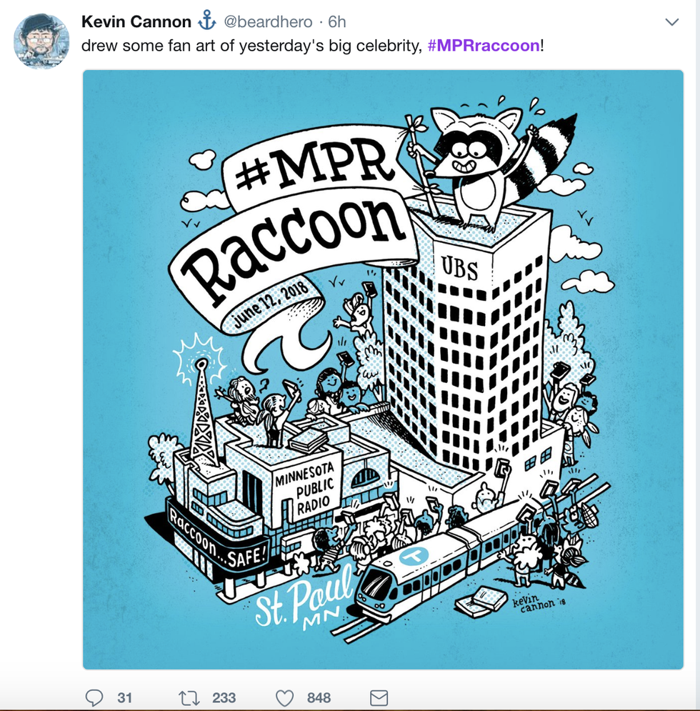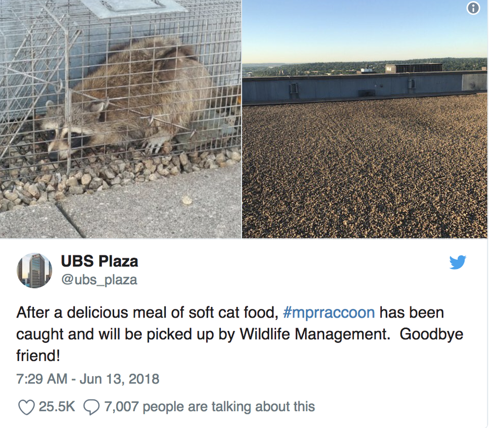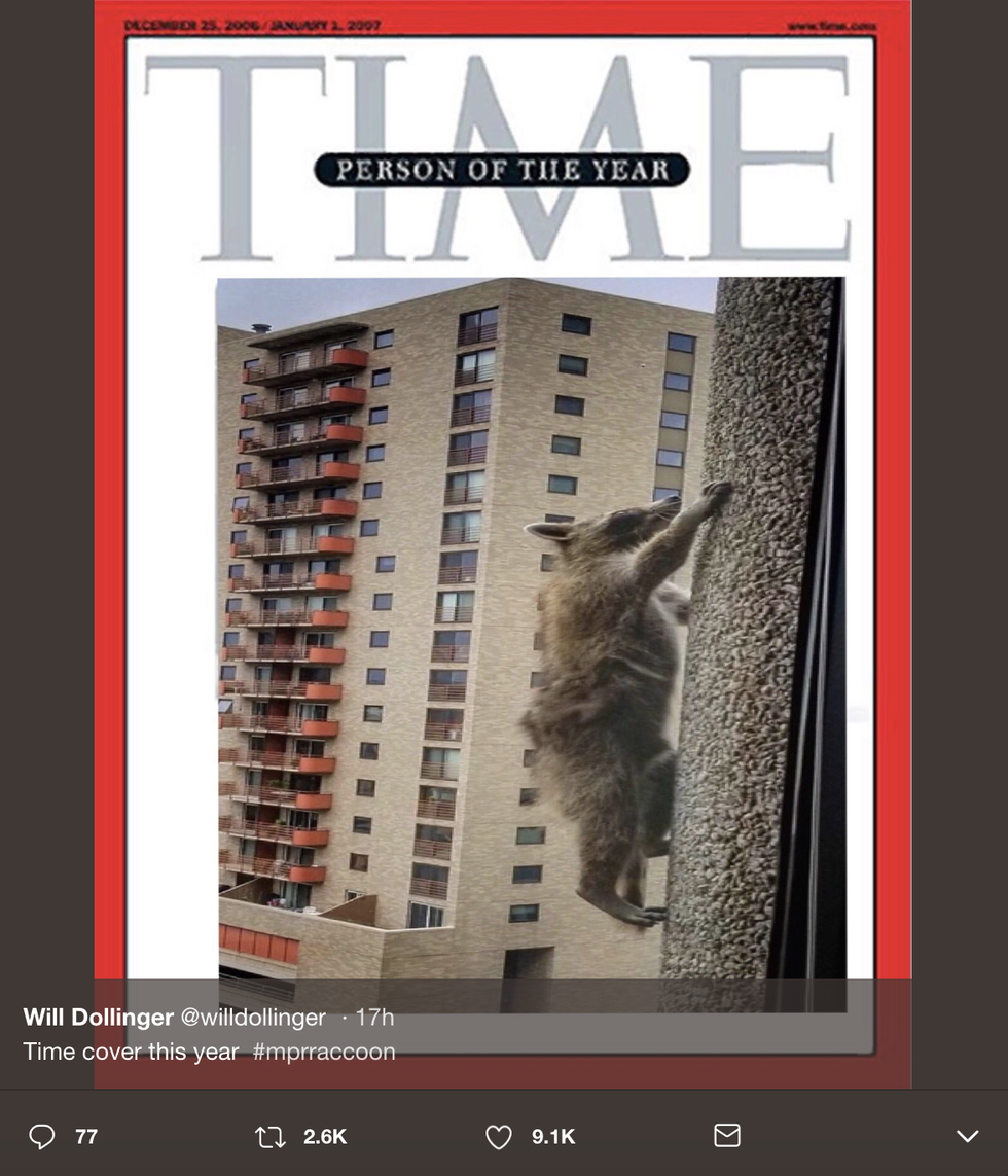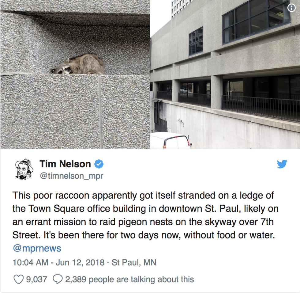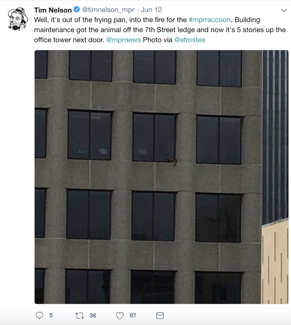 What we would soon know as the "MPR Raccoon" started his journey as what some assume was a quest to find food in pigeons nests in the skyscrapers ended up being an epic journey for survival. Luckily, a member of MPR, Tim Nelson, took to social media to share all of the latest updates of the raccoon's climb.