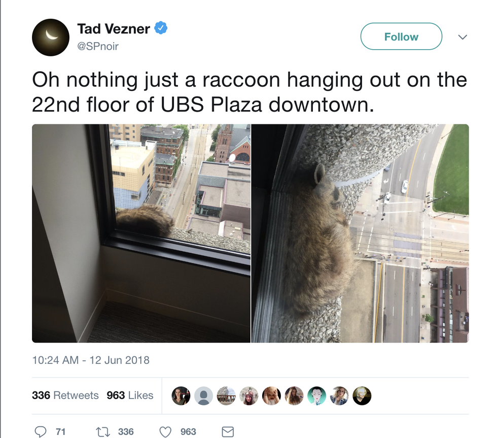 While most of us are impressed with ourselves if we get out of bed before noon, work out at a point during the day or go to bed at a recent time, this raccoon in St. Paul knocks us out of the park by scaling a skyscraper. Yes, you read it correctly. While raccoons are known to be skilled climbers, it was quite unexpected when this little guy made it up a 25 story building on Tuesday, which proved to be a struggle that captivated the Twitter universe.