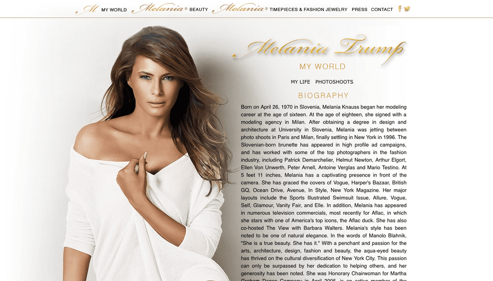 Melania’s website gives a brief history of Trump’s life along with promoting her beauty and jewelry lines. For those of you who don’t know, Melania is Slovenian, which is evident in her thick accent. She moved to New York in 1996. She soon after met Donald Trump and they began dating. In a famous anecdote, which has been repeatedly used in interviews and profiles of Melania, she says that she met Trump at the Kit Kat Club in 1998. Donald arrived with another woman and tried to get Melania’s number while his date was in the bathroom. Melania refused and instead asked for his number so that he would have to wait on a call from her. The anecdote has been used in many articles, the critical GQ profile, and Du Jour’s recent piece.