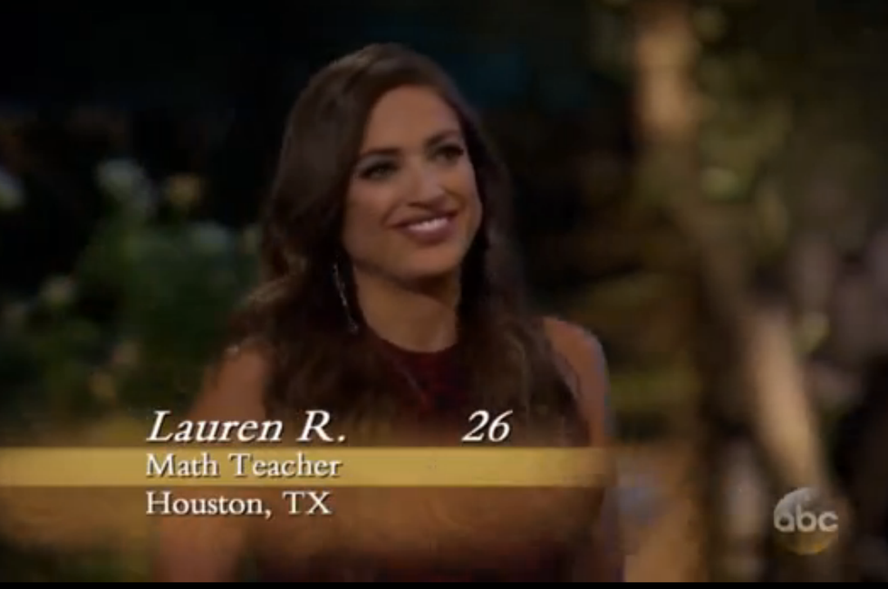 I liked her because of three reasons: 1. She looked like Emma Stone's doppelgänger. It's quite fascinating. 2. She was two letters off from being yet another Lauren. And 3. She used her red hair to her advantage, and gave him a nickname to remember: Red Velvet. I thought her first impression was pretty cute, and I also couldn't stop thinking of how crazy it was that Emma Stone was on the Bachelor. She did get annoying later on when you realized she was kind of a follower to Lace's rude comments and didn't have a likable personality.