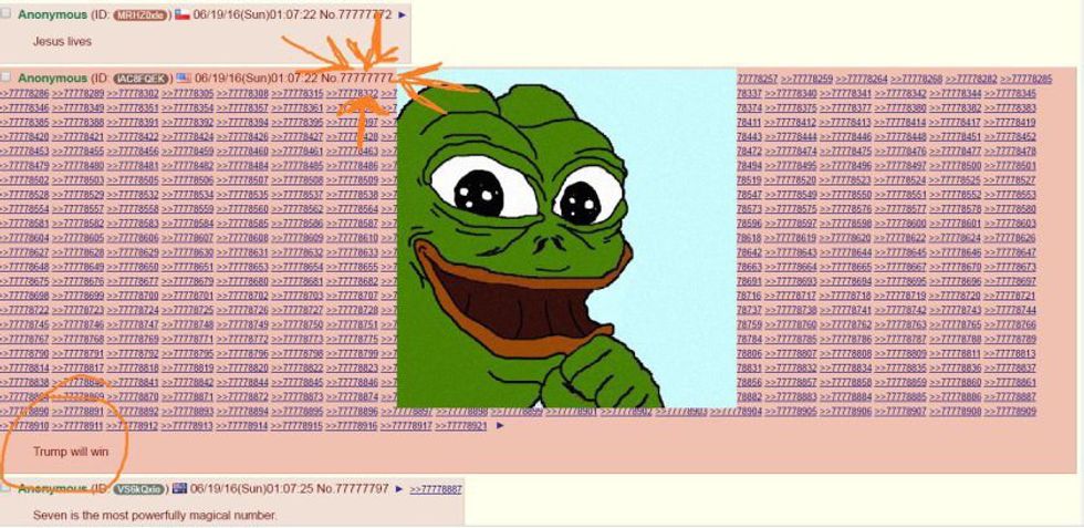 To the users of /pol/, Donald Trump represented /pol/ itself. He was loud, brash, unapologetic, unpolished, and chaotic above all else. Trump became the primary focus of posts on /pol/ rather quickly, and some bizarre coincidences began to emerge. These mostly manifested themselves as posts that were pro-Trump getting dubs with almost regularity until something strange happened.