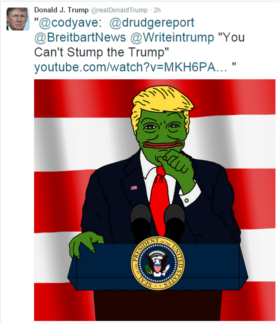 The third and final event was the Anti-Defamation League declaring Pepe to be a symbol of white supremacy due to its association with the alt-right, a decision which drew the ire of almost everybody on the Internet. The use of Pepe by the alt-right is overall a very slim minority of people who use the meme. Pepe has reached a sort of cultural ubiquity in which major celebrities are tweeting out Pepe memes on occasion, including Donald Trump himself.