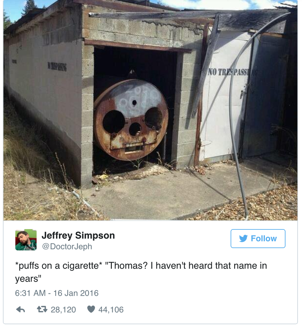 After taking a picture of an old train, someone captioned the photo as shown above, paying tribute to the classic train, Thomas the Tank Engine.