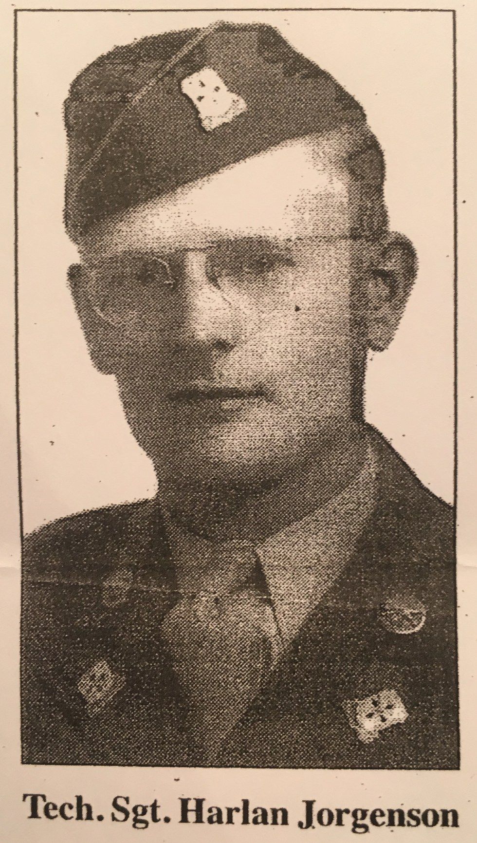 It is with regret that I am writing to confirm the recent telegram informing you of the death of your husband, Technical Sergeant Harlan C. Jorgenson, 37, 313, 734, Infantry, who was killed in action on 28 October 1944 on Leyte Island, Philippine Islands."