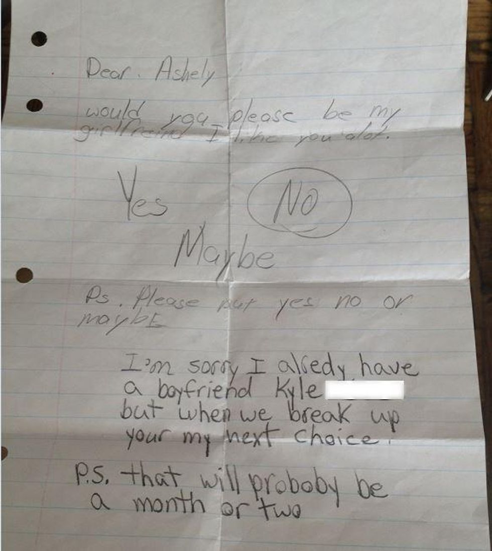 That question should be rephrased to: "will you be considered my 'girlfriend,' but never: talk to me, sit by me at lunch, or act like you like me?" And yes, you are welcome for forcing you to remember your girlfriend(s)/boyfriend(s) from middle school. Thank goodness we matured and got over our fears of talking to our significant others because those were some awkward times. Am I right or am I right? I'm right. As awkward as it is though, middle school would not be the same without the "so-and-so has a crush on you," or "who do you like?" notes passed during class. And oh we cannot forget my personal favorite, the boy who would never ask or pass the note himself, it was always one of his friends. Ah, young love, gotta love it even in its most awkward forms.
