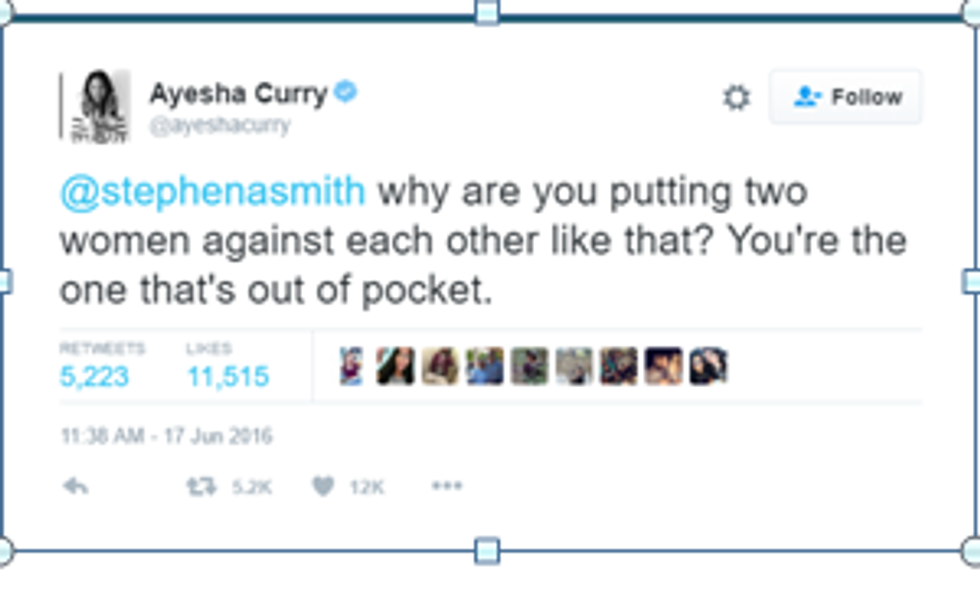 What Stephen A. Smith was trying to say is that Steph Curry needs to do a better job at controlling his wife like Lebron James appears to have controlled his wife. Because she stays silent and out of the media’s eye constantly. Ayesha fired back at Smith with this tweet: