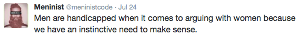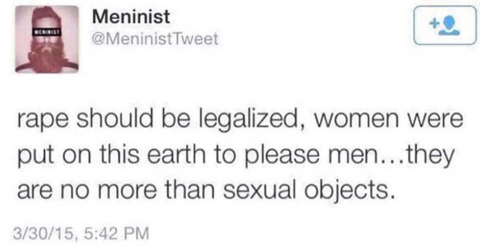 Now, for the past year I've been ignorant of this movement and just how much it is geared toward bashing feminism and the fight for gender equality. "Meninism" is a men's right movement that claims to campaign for men to have the same rights as women. A large part of this movement has been spurred on by social media accounts that tweet sexist and anti-feminist content.