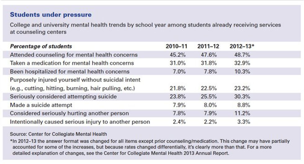 The statistics above represent the number of students under pressure who have sought out counseling, so the number of people who did not seek medical attention is unknown in this study. The percentages of suicide attempts, hospitalizations and self-injury increased each year, as with every category. There is a serious problem here that needs to be addressed. If college students do not get treated, they may have trouble succeeding in their classes, and this will affect what happens with their career and overall future. Everyone deserves to be able to do their best, especially students, since they have a lot of stress on their shoulders already.