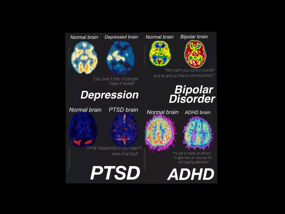 Yet people, continuously say that "its all in your head" without realizing that what you are saying is actually true; that MENTAL health disorders are in the head, they are effecting the way the brain functions. If you look at brain-scans (I will show a picture) each disorder effects different parts of the brain and how the brain works. In order for the brain to work properly, every part of the brain needs to function 100%.