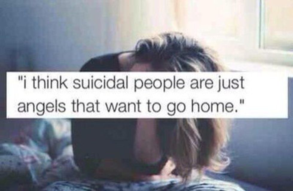 Mental illnesses are de-habilitating. Like any other serious illness, they can consume one's life. Depression is not and will never be beautiful. It will not make you beautiful. Going through a hard or confusing time where you feel sad or lonely does not mean you have depression. Anxiety is not and never will be tender. It will never make you cute. Being afraid of something or nervous about a situation does not mean you have anxiety. Eating disorders are not and never will be misunderstood. They will not make you fulfilled. Being unconfident about your body or needing attention does not make starving yourself of the things you need to live is the answer. Buying into pictures like the one above is helping no one. Suicide is a very real and very serious issue that should not be plastered as a solution over pretty pictures in pastels or black and white. Suicidal people are not angels that want to go home, they are people who are in drastic need of help because of everyday they live in pain they cannot escape on their own. Mental illness isn't a choice and it is a disgrace that it has become glamorized to the point where kids are constantly seeing messages that value the struggle and the illness over human life.